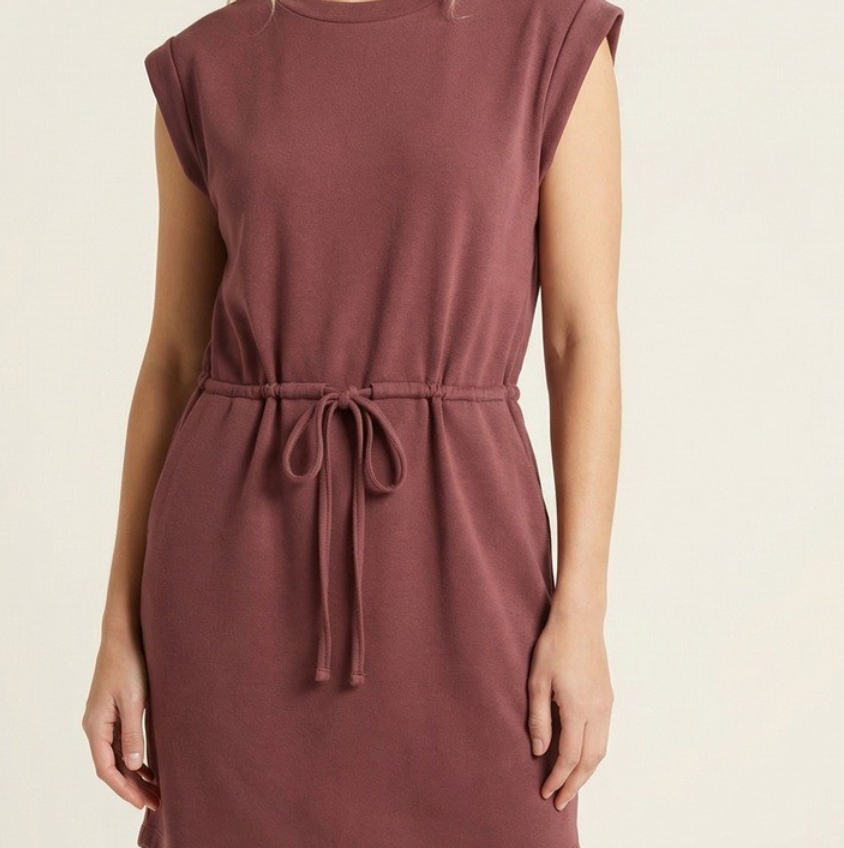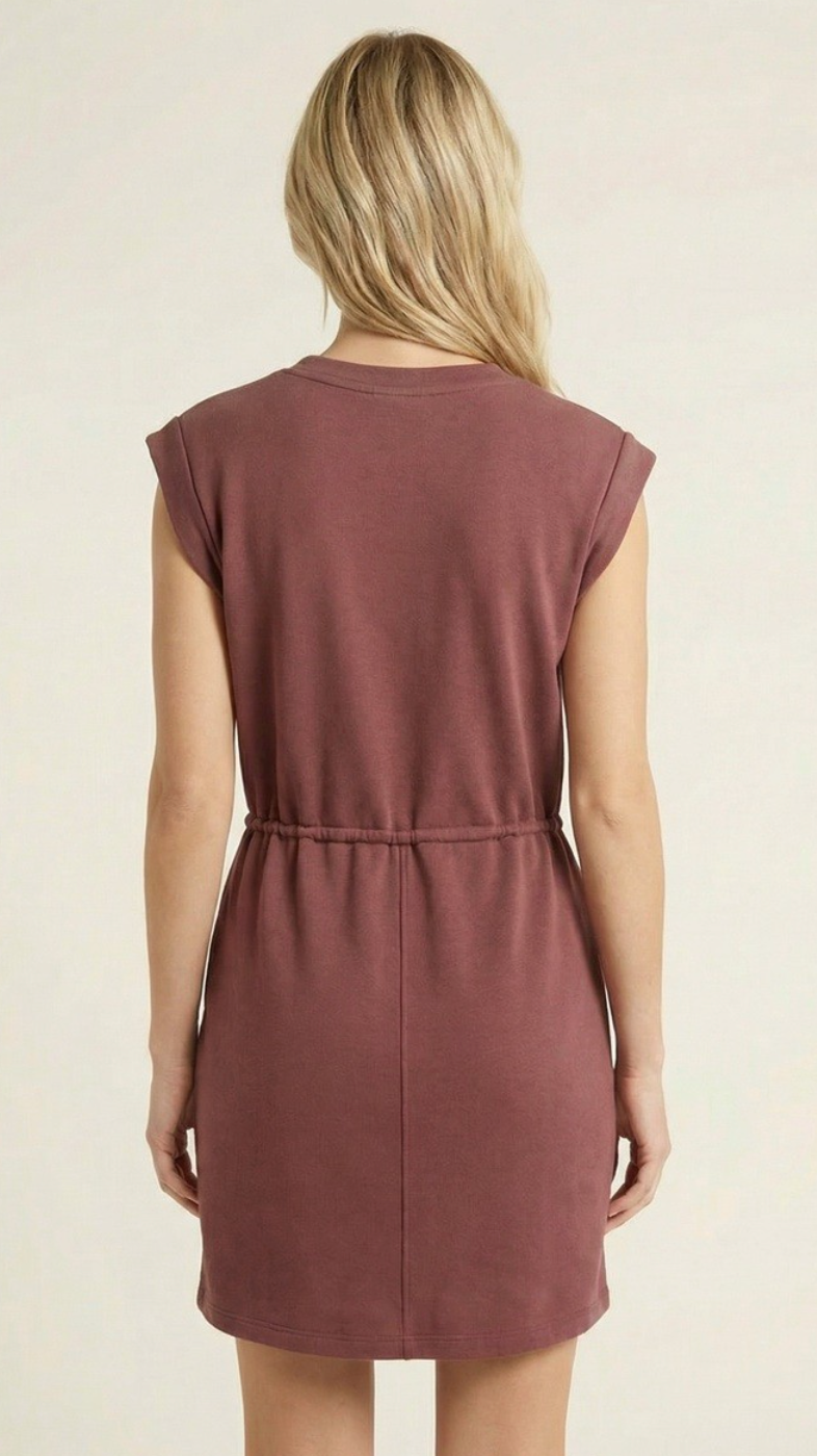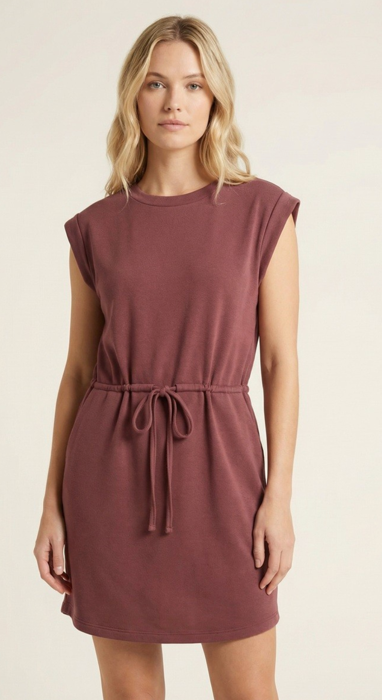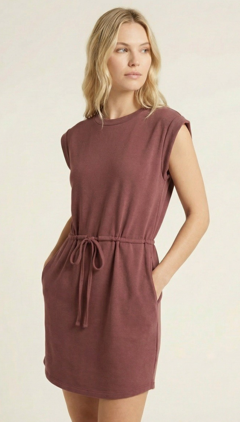 DRAWSTRING WAIST, SHORT SLEEVE, SOLID TERRY DRESS WITH POCKETS